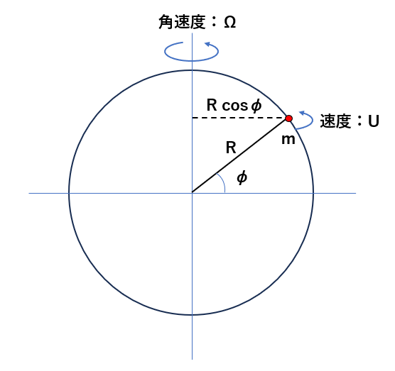 よってmの点の角運動量=①+②=mRcosΦ(ΩRcosΦ+U)=一定となります。
