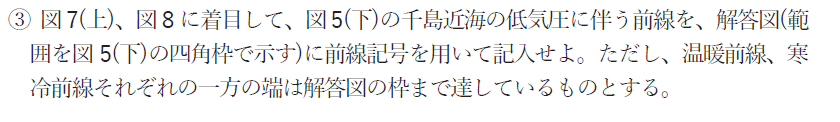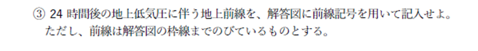 - 問題文の前提条件を確認する。前線を枠まで到達して記載する。記載すべき前線の種類など。