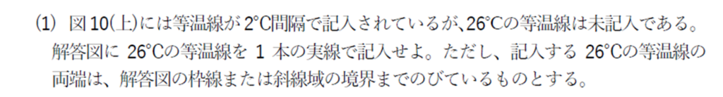 解答は一本の実線で、周りの等温線の温度を考えると、必ず26℃の等温線が通るところは上図となることが推測できます。