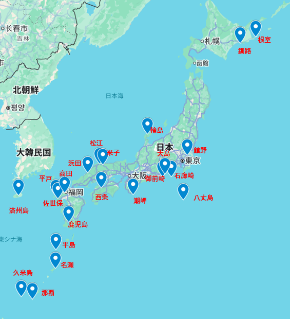 最近では、館野の他、八丈島、潮岬、名瀬、浜田、平戸などの場所はよく出てきますし、房総半島、紀伊半島、能登半島などの半島名も当たり前のように問題文に含まれていることが多いです。