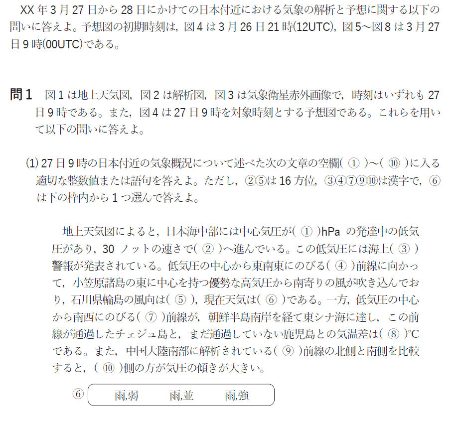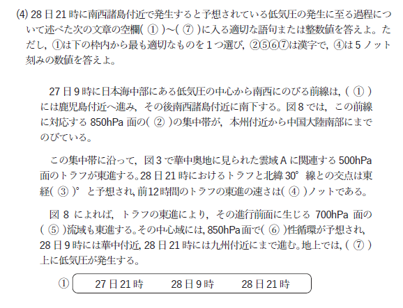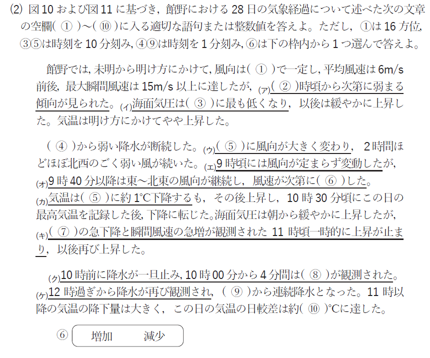 この穴埋め問題は大気現象の記事や気象要素の時系列を見れば比較的簡単に解くことができますので完答したいところ。