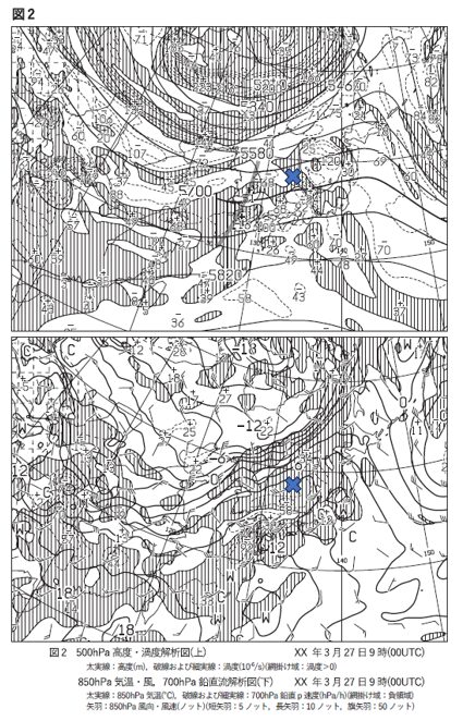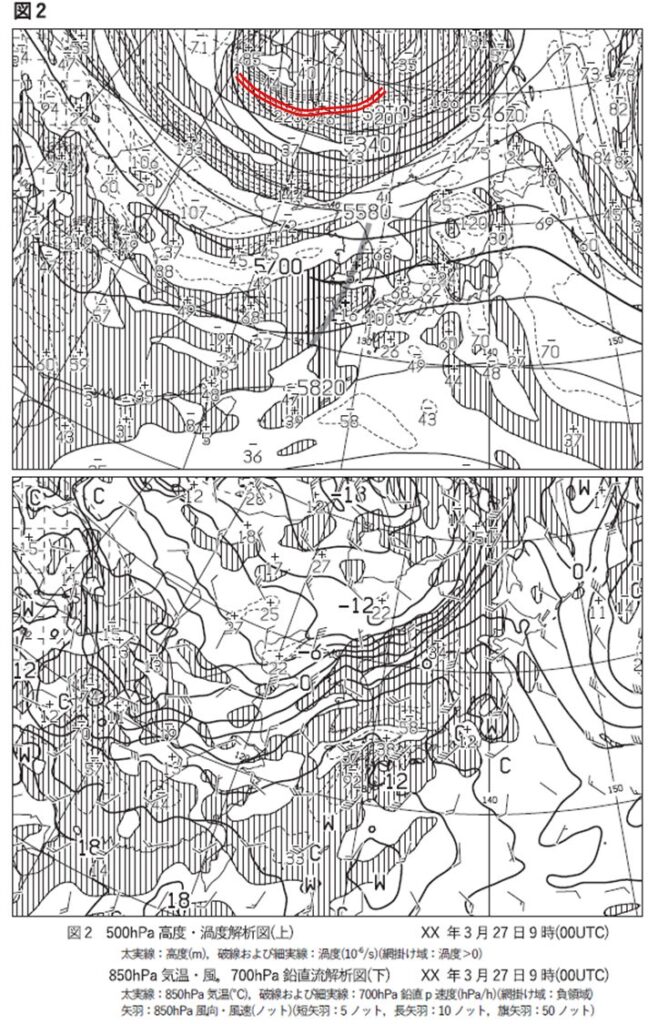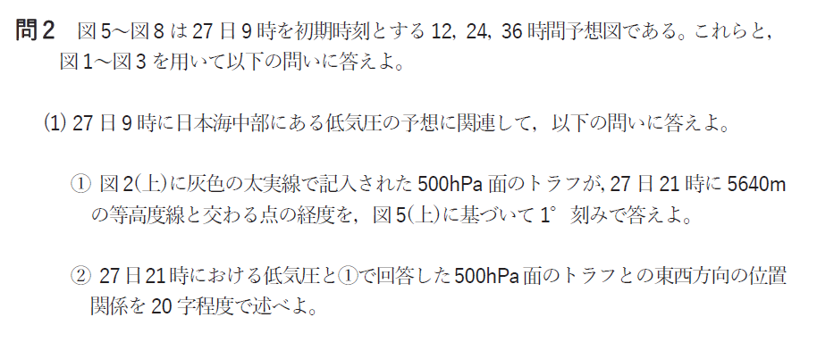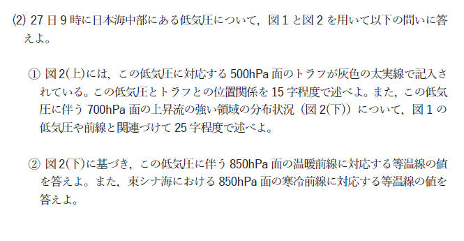 問1の(2)の①では、低気圧に関連するトラフや上昇流の状況を読み取ります。