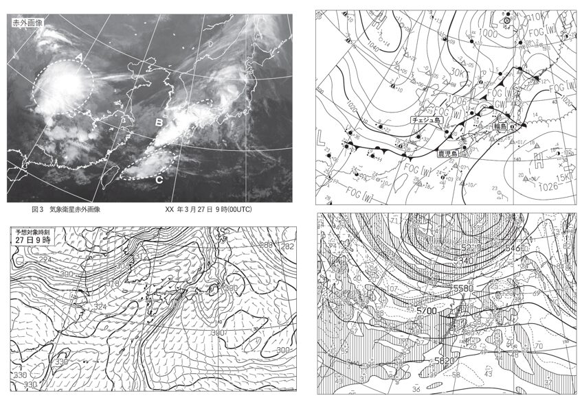 左上に赤外画像、右上が地上天気図、右下が500hPa天気図、左下が850hPa天気図です。