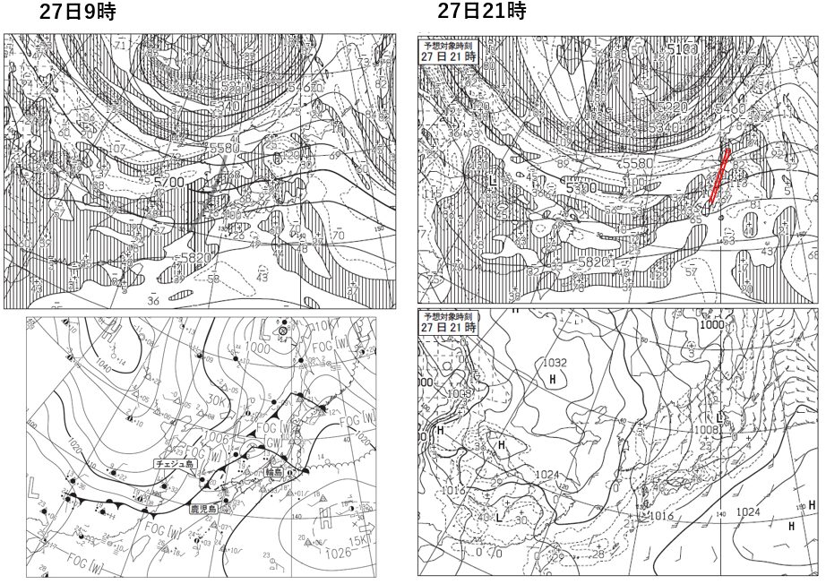 トラフの移動から考えてもこのあたりであろうということは想定でき、赤線が27日9時のトラフといいうことになります。