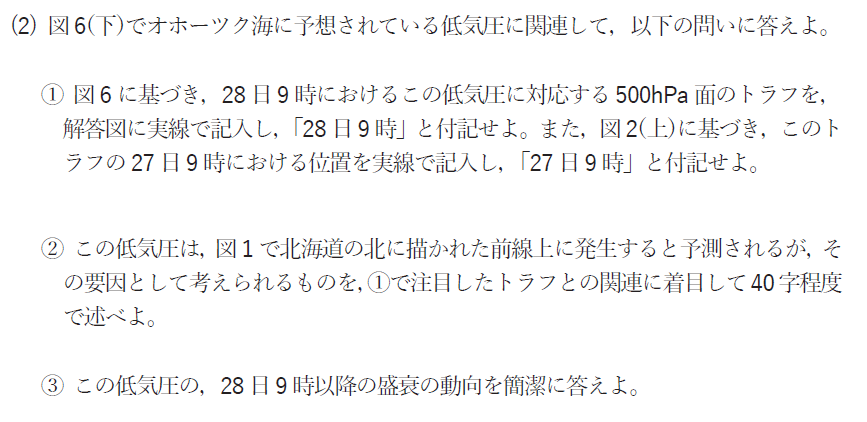 トラフ解析や前線解析の他、記述問題も多く時間のかかる問題構成でしたね。