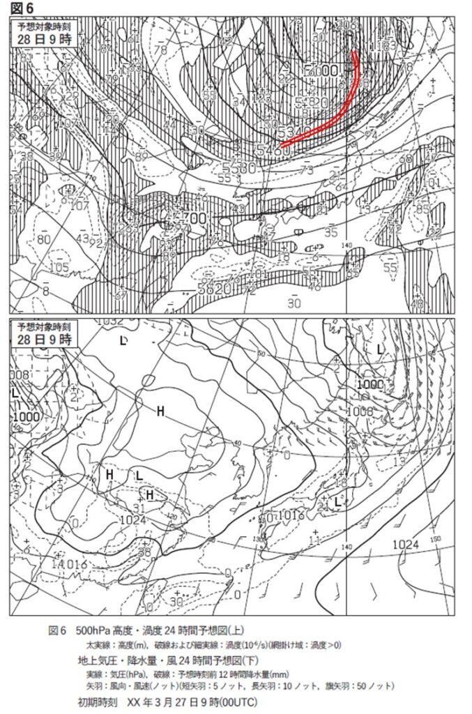 今回であれば+258×10-6/sの極大値を中心としてそれを取り囲む点線の渦度が大きい範囲がトラフの参考になりますのでそれを目安に線をひくと赤線のようになります。