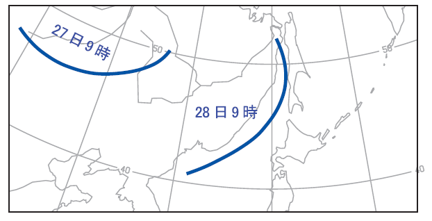 問題文から前線の種別は12時間前の移動に基づいてと記載がありますので、28日9時の12時間前である27日21時の予想図からみていくことにしましょう。