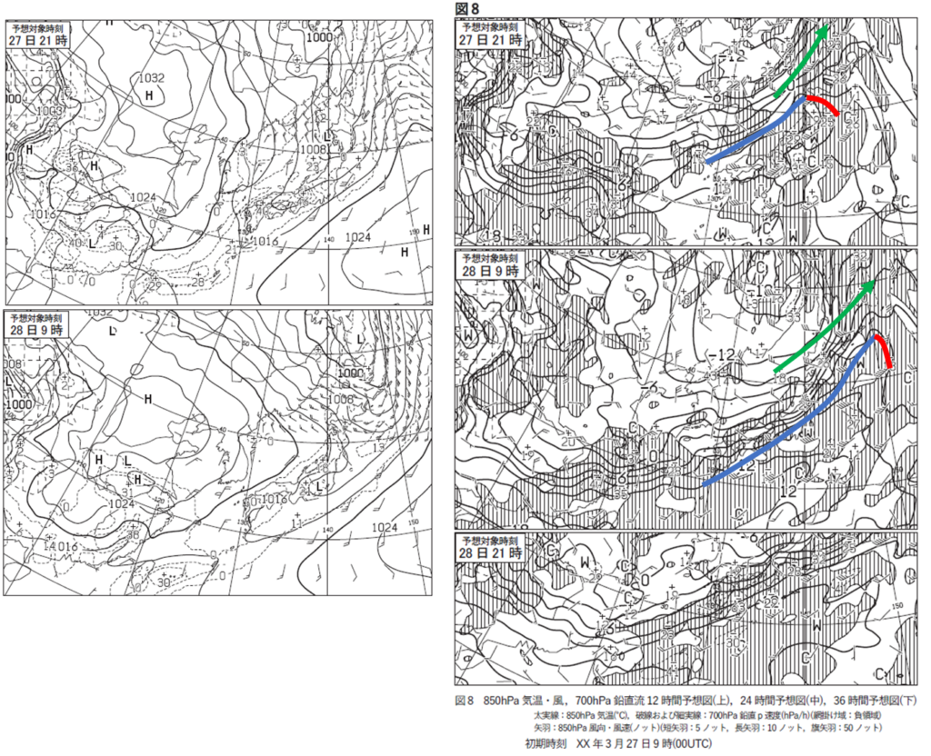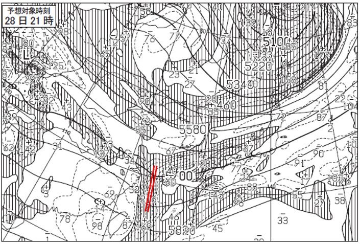 ちなみに、青と赤で記入した線が850hPaでの前線位置、緑が500hPaでの強風軸の位置を示しています。