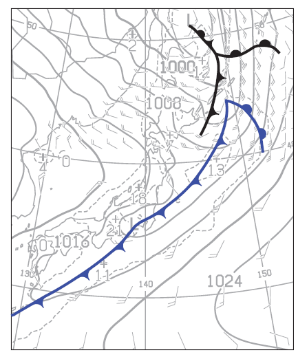 あとは地上天気図から、気圧の谷および風向、降水域を見ながら前線を引くと解答のようになります。