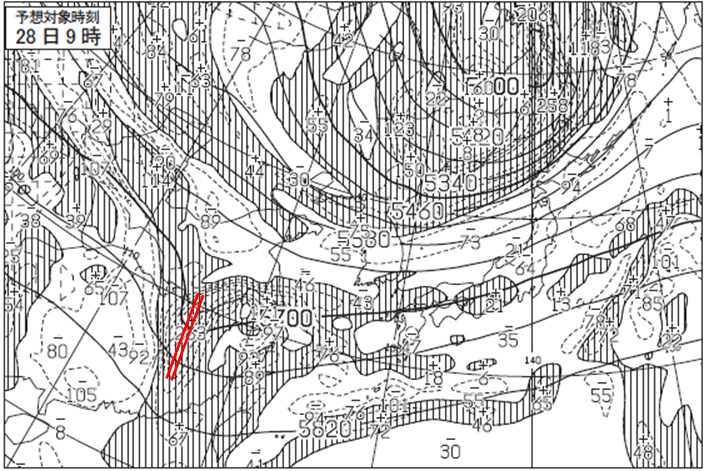 まず28日9時でのオホーツク海に予想されている低気圧に対応するトラフを考えます。