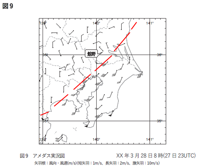 これらをまとめると「シアーラインの南東側は南西の風で相対的に強く、北西側は北よりの風で相対的に弱い。」となります。