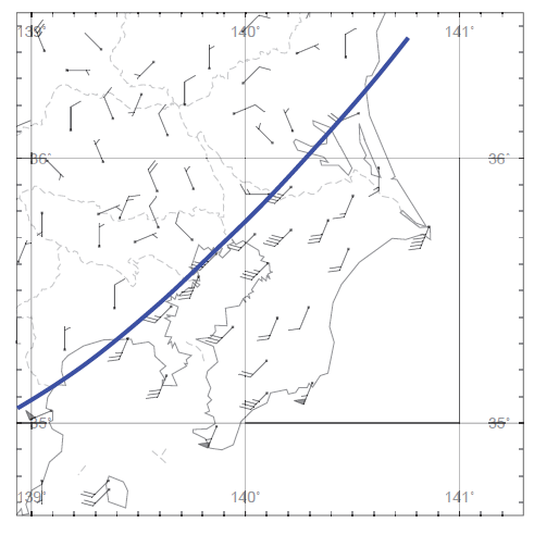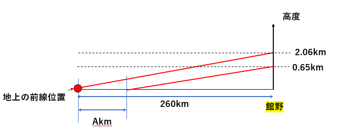 前線位置から館野までは260kmですので1/F=2.06/260≒1/130となります。