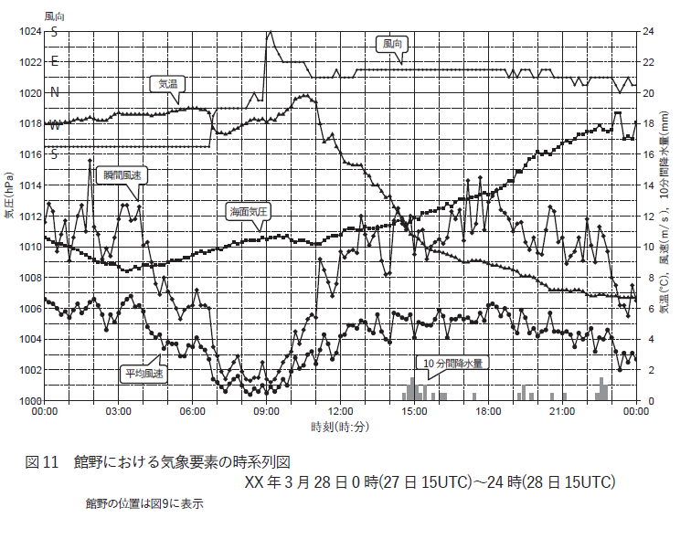 この時刻では風向の変化や気温や風速の減少が確認できます。
