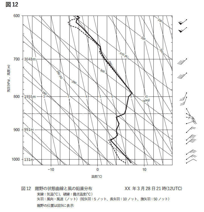 これを考慮すると、850hPaでの温暖前線に対応する等温線の値は6(9)℃、寒冷前線では12℃となります。