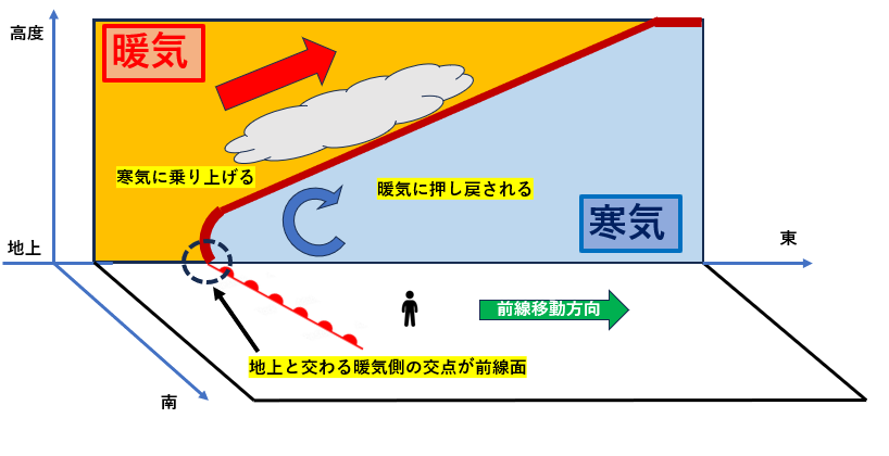 温暖前線というのは寒気より暖気の勢力が大きく、寒気を押すように進むときにできる前線のことです。