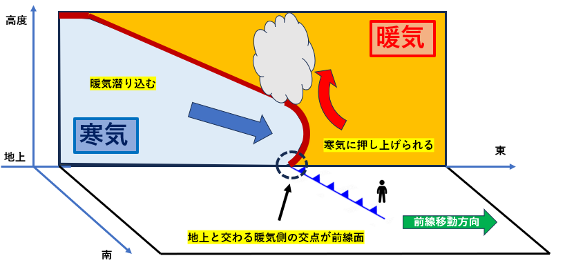 異なる温度差の空気がぶつかるということは、暖かい空気は上昇することになるので、前線付近では雲ができ雨が降ります。