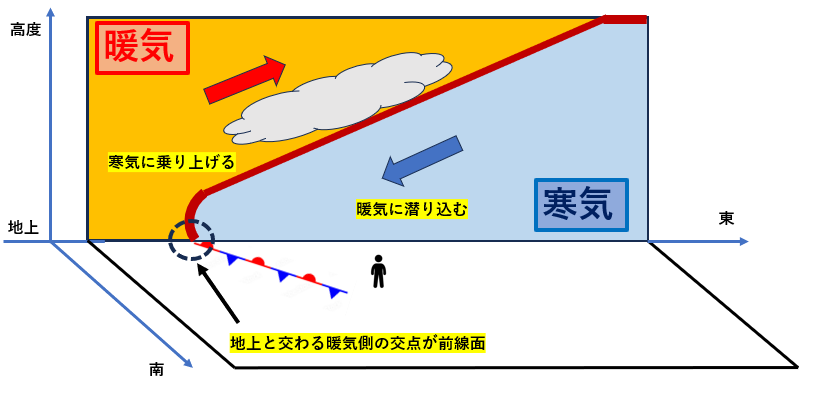地上の前線は立体的な温度差の異なる空気がぶつかることによって作られます。