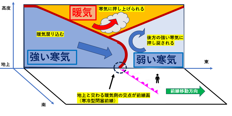 寒冷前線というのは暖気より寒気の勢力が大きく、寒気が暖気に潜り込むように押しのけて進むときにできる前線のことです。