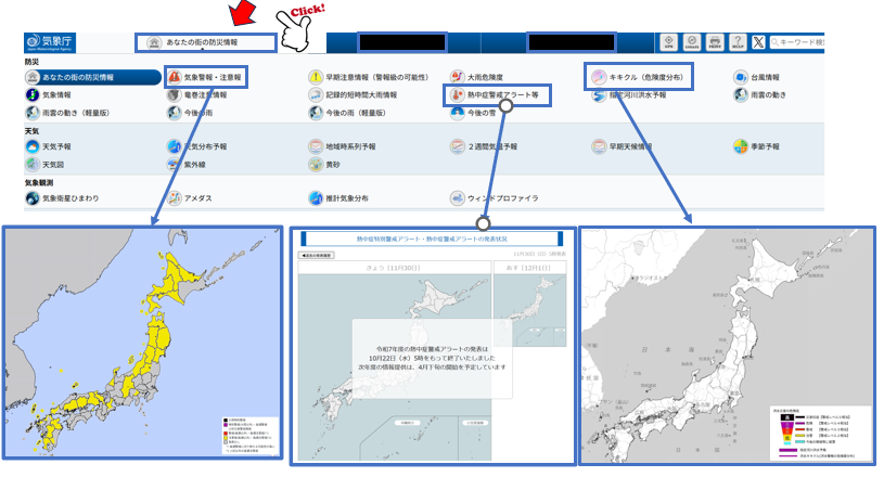 気象警報・注意報、熱中症アラート、キキクルなど防災に関連した情報もタイムリーに確認することができます。