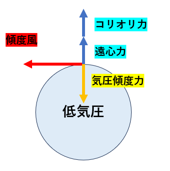 傾度風平衡というのは、気圧傾度力がコリオリ力と遠心力の和と釣り合っている状態のことを指します。
