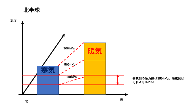 bの図で考えると、同じ高度で見たとき寒気側850hPaに対しては暖気側約900hPa、寒気側500hPaに対して暖気側約800hPaなので、上空の方の圧力差の方が明らかに大きい。