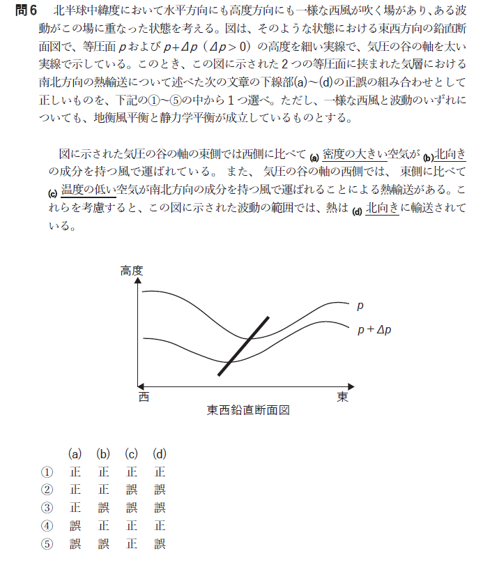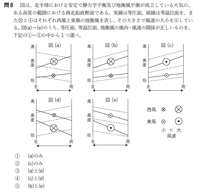 ただ気象業務センターの出題意図としては(e)が正解となるよう、北側の気温が高くなるように等温位面の傾きを等圧面より急にしておきたかったとのこと。