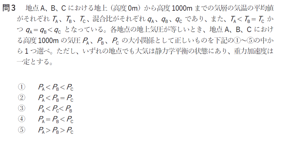 高度1000mでの地点A、B、Cでの気圧を考える問題です。
