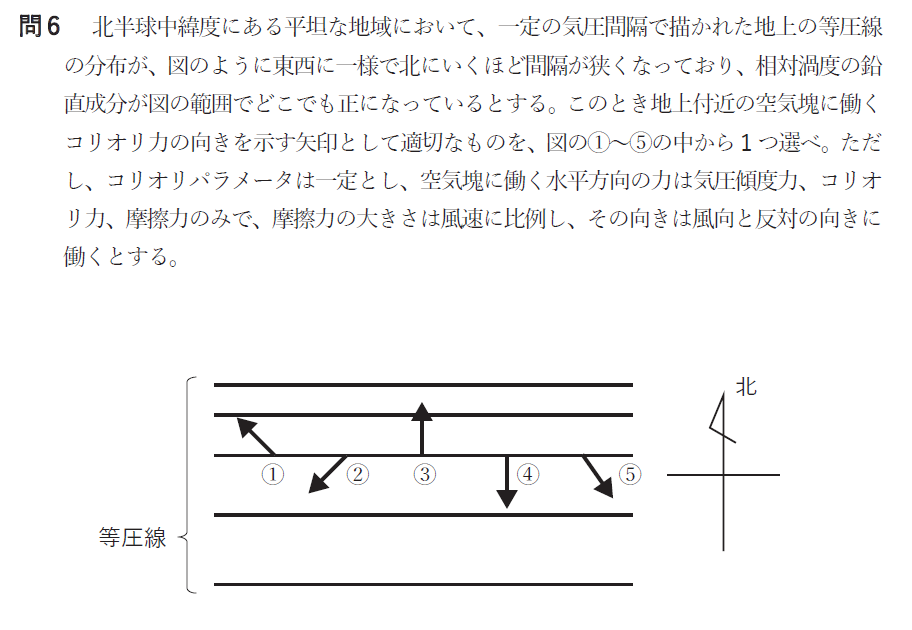 問題文の中でポイントになるのは、等圧線の分布は東西に一様で間隔が狭くなっており、相対渦度の鉛直成分が図の範囲でどこでも正となっているという点です。