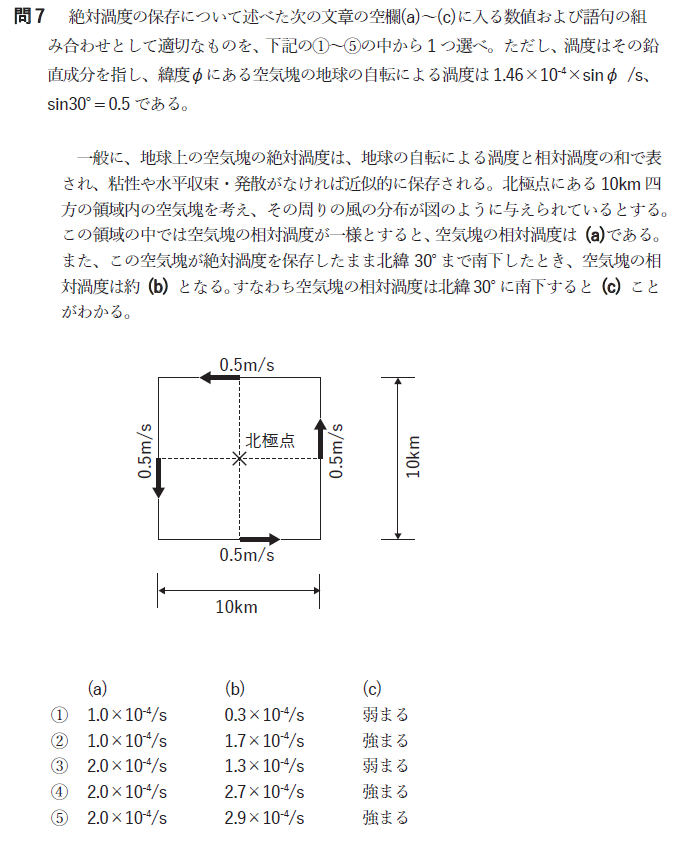 問題文の式から絶対渦度北緯90°=2.0×10-4/s+1.46×10-4×sin90°/s=3.46×10-4/sとなります。