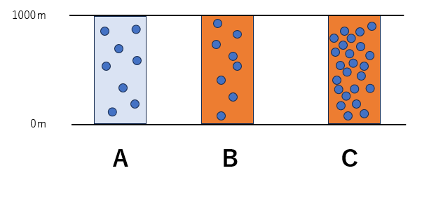 0mでの気圧を同じとするためには、AにはB、Cより軽い空気が、BはCよりも軽い空気が載っていないと同じにならないですよね。