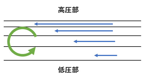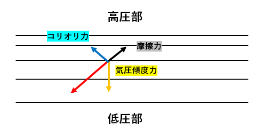あとは北から南に向かって気圧傾度力が働くことを考えると、コリオリ力はこのような向きに働くことになりますね。