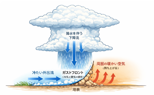 問題文の通りで、ガストフロントは外出流の先端が周囲の空気と衝突する部分に形成されます。