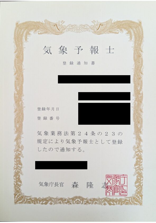 登録を受けるとこのような通知書を受け取ることができ、晴れて気象予報士となることができます。