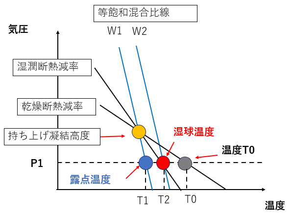 湿球温度計に通風される未飽和の空気(温度T0)の混合比をW1、湿球を通過した空気の混合比をW2としてW1、W2それぞれを飽和混合比とする温度をT1、T2とした図はこうなります。