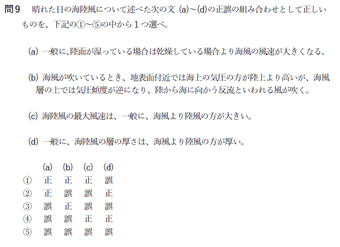 問題文の通りで地表面付近では気圧の高い海から陸に向かって風が吹きますが、上空では気圧傾度が逆になり陸から海に向かって風が吹きます。