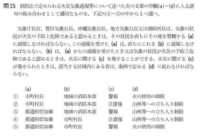 気象庁長官、管区気象台長、沖縄気象台長、地方気象台長又は測候所長は、気象の状況が火災の予防上危険であると認めるときは、その状況を直ちにその地を管轄する(a)都道府県知事に通報しなければならない。この通報を受けた(a)都道府県知事は直ちにこれを(b)市町村長に通報しなければならない。(b)市町村長は(a)都道府県知事からの通報を受けたときに又は気象の状況が火災の予防上危険であると認めるときは、火災に関する(c)警報を発することができる。火災に関する(c)警報が発せられたときには、該当する区域内にある者は、条例で定める(d)火の使用の制限に従わなければならない。