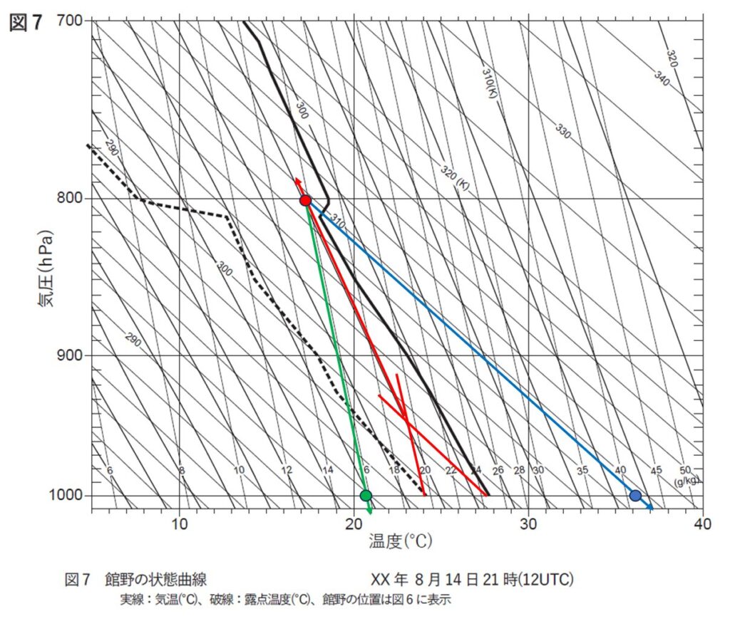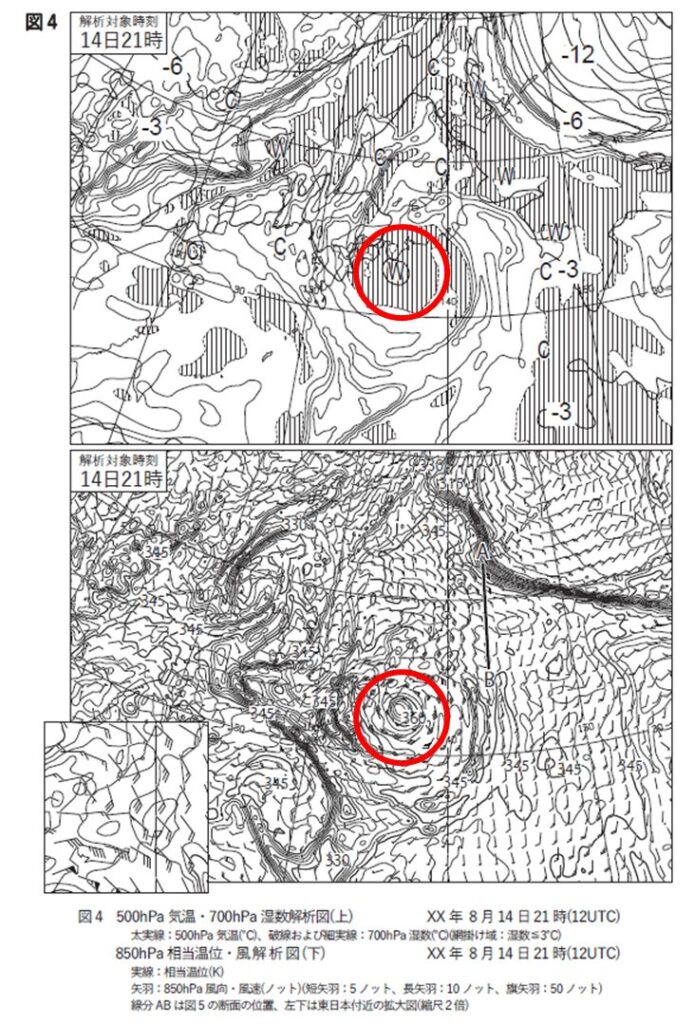図5上によると、対流雲域付近では、900hPa付近から上空にかけて鉛直方向の相当温位の勾配が小さく、相当温位が周囲より⑥高くなっています。