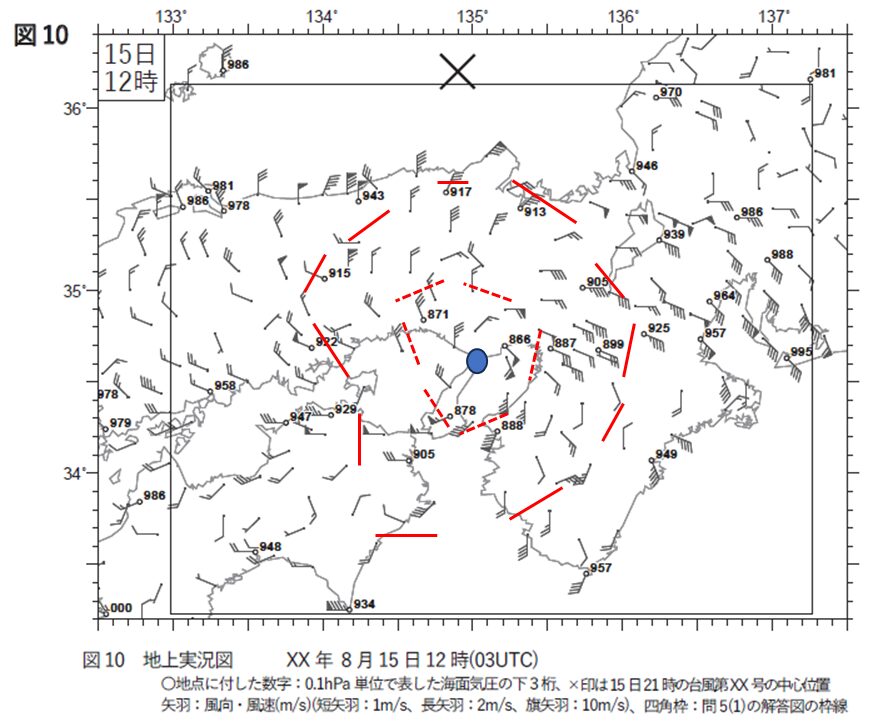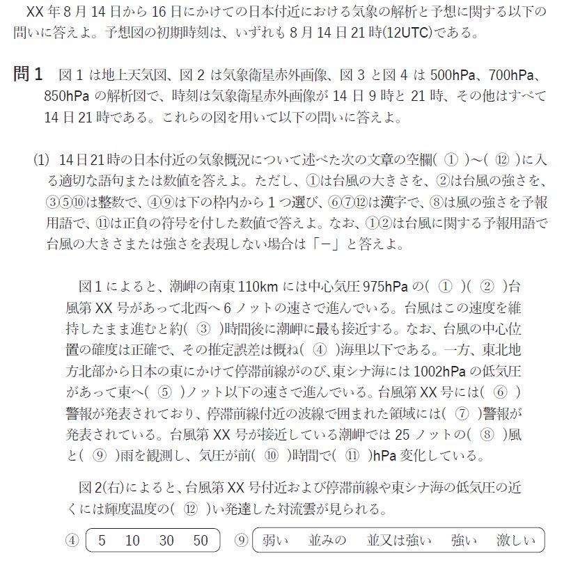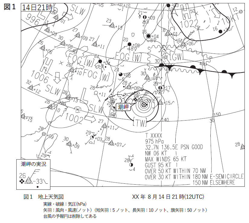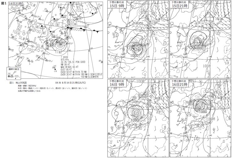 図1によると、潮岬の南東には975hPaの①-で②強い台風第××号があり、北西へ6ノットの速さで進んでいます。