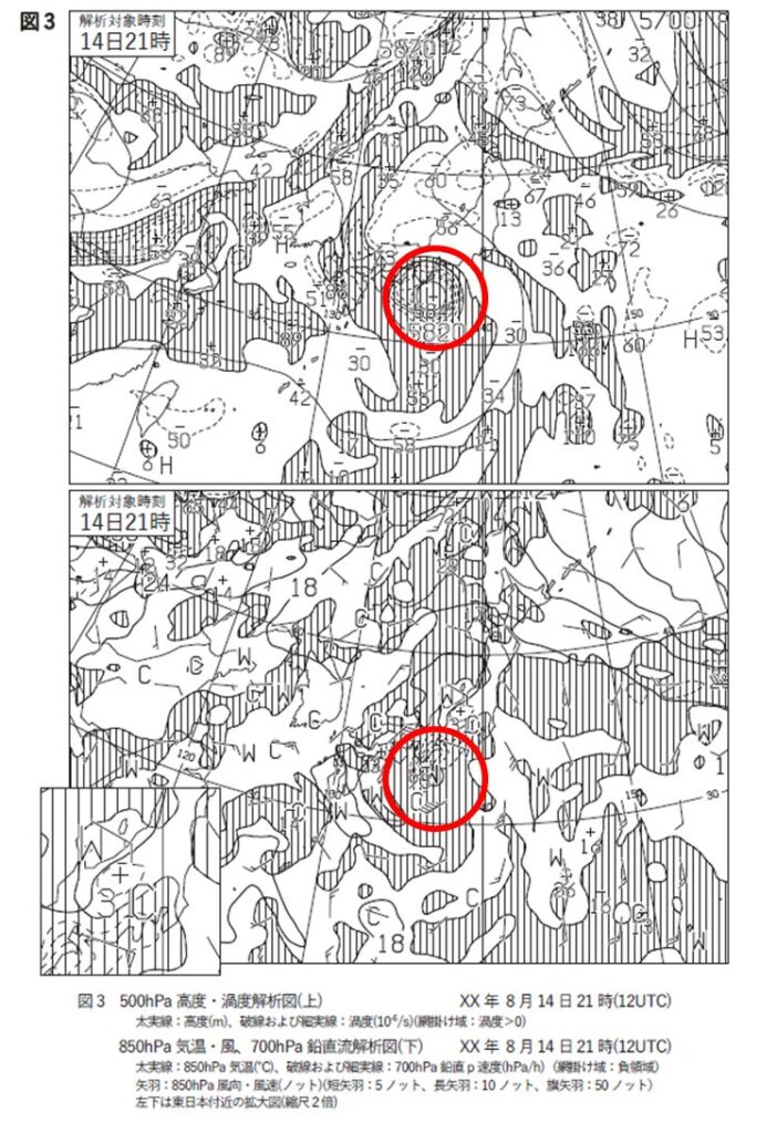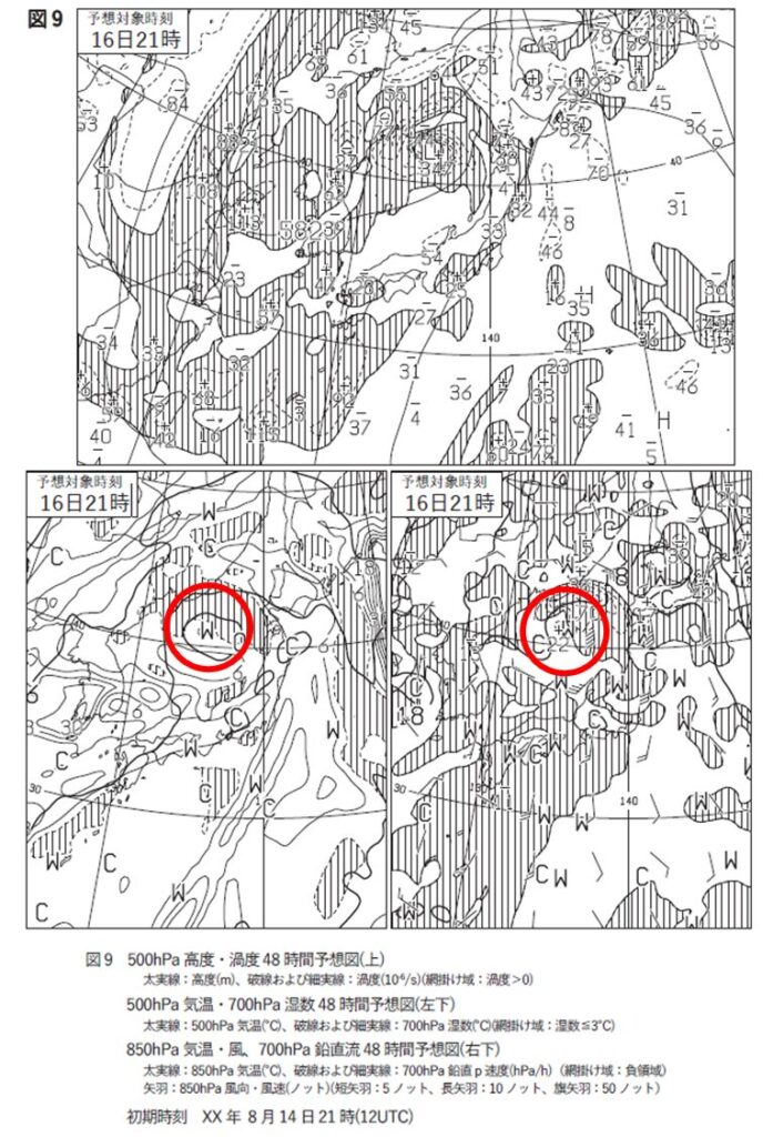 700hPaは「中心の南~西側が下降流となり、南側は相対的が乾燥する。」、850hPaでは「中心の西~北側が相対的に低温となる。」です。