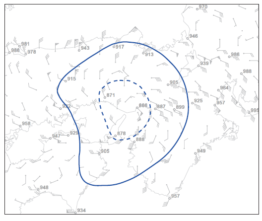 明瞭であるということは周囲との気圧差が大きく、回転速度が速い台風がより強い状態であることが言えますね。