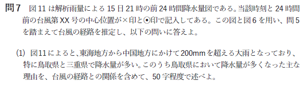 答えは「台風が鳥取県の東側を通過し、北よりの強い風による地形の影響によって台風に伴う降水がつよまったため。」となります。