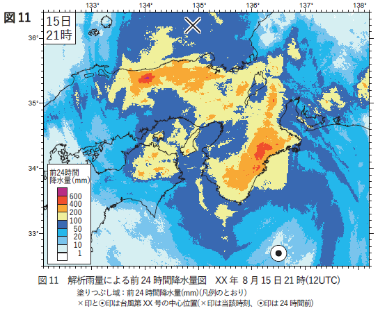 台風の中心位置が×と●で示してあります。