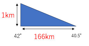 また前線面の傾きについては緯度の差が1.5°ですので、距離に直すと約166km。