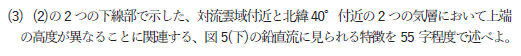 まとめると、「対流雲域付近は全層で上昇流となっているが、北緯40°付近は700(750)hPa付近から上空で下降流となっている。」となります。