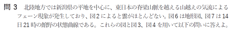 複数の天気図を使用し鉛直流と湿数、気温について読み取る問題です。