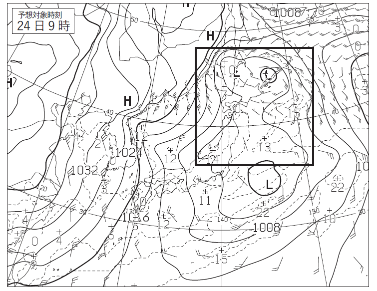 23日21時のトラフを読み取るのですが、①で低気圧中心を確認した24日9時ではないので注意。