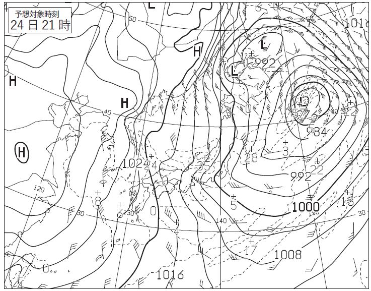日本の南には1008hPaの発達中の低気圧があり、この低気圧に対して③海上暴風警報が発表されている状況。