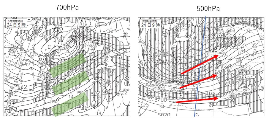 と思われた方もおられるかもしれませんが、単純に、上昇流域と等値の湿潤域(湿数が小さい)が重なる範囲が大きい方を選択すれば問題ありません。