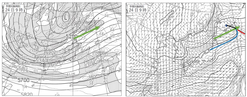 なぜ気温場の尾根、つまり北に凸となっているところを参考にするかというと同じ高度で見たときに気温差が大きいところだから。