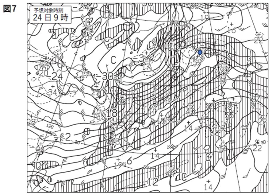 24日9時の低気圧中心に対応するトラフは概ね右の赤二重線。